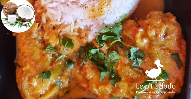 Poulet mijoté dans une sauce au lait de coco. Servi avec du riz thaï blanc et des grains, relevé de coriandre fraîche.
